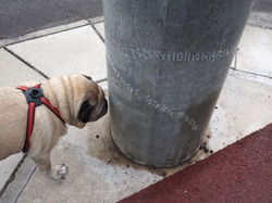 It is common to see dogs peeing on telegraph poles in Japan. When other dogs are nearby these telegraph poles, they are able to use their sense of smell to communicate with others. By marking on their existence, dogs create their own territories through their urinal marking onto objects in the streets. I became interested in this instinctual behavior of ‘marking’ that is not as easy for people to do. In this piece I used charcoal to mark numbers 1-60, marking my existence onto familiar streets and parks.